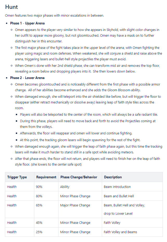 The First (aka Omen) is the finale boss for Act 1 of the game’s quest. She’s an important moment that needed to have a big impact on the players and about halfway through all the content that currently exists.