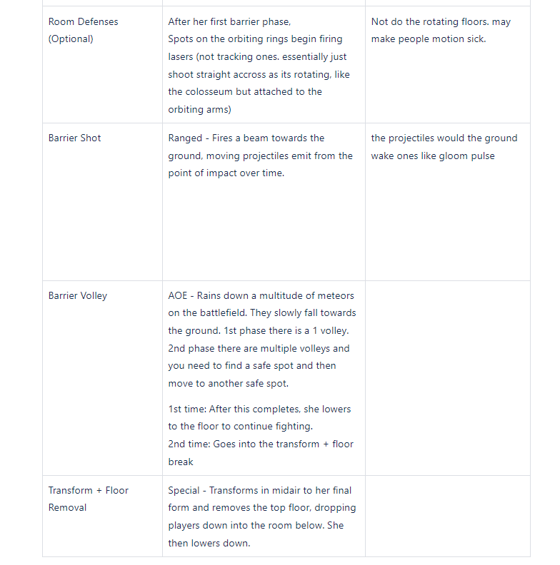 Her original design detailed the arena itself being a kind of weapon that fired lasers at players along with constellations that the players needed to keep track of to stay safe and solve mechanics in the arena. In the bottom of the floor behind glass would be constellations that players would need to use to stay safe during phase mechanics. At the midpoint of the fight, she would destroy the machine she was using to completely transform the level and escalate mechanics.