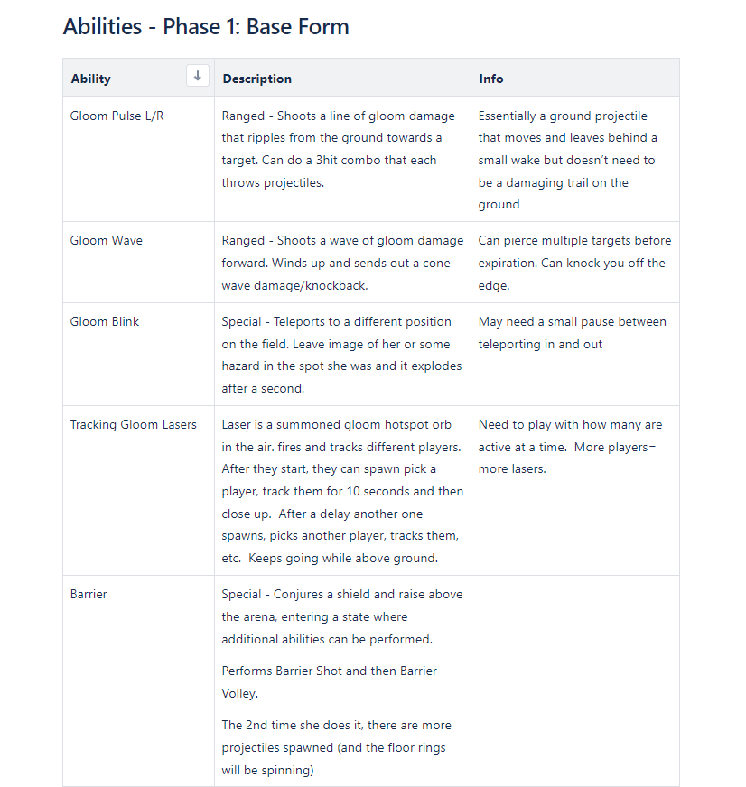 I paper designed, prototyped, polished, and shipped a total of 12 boss encounters (7 currently live), three of which are finale fights featuring unique mechanics, engaging narrative beats, and moments of huge spectacle In addition to these fights, I also maintained or shipped another 4 fights and had a hand in helping design others in the game.