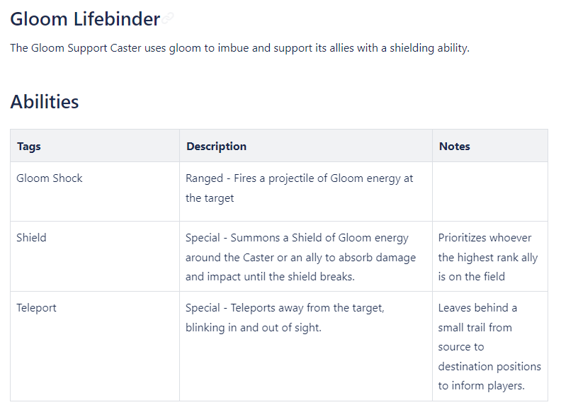 A single creature’s complexity should scale with its enemy class - simpler soldier creatures like the Lifebinder below should only have one special attack (the shield) whereas elite creatures, should have more layered complexity.