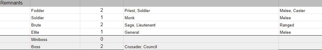 Fodder - most basic attacks, with one or two melee attacks, designed to die in 2 hits